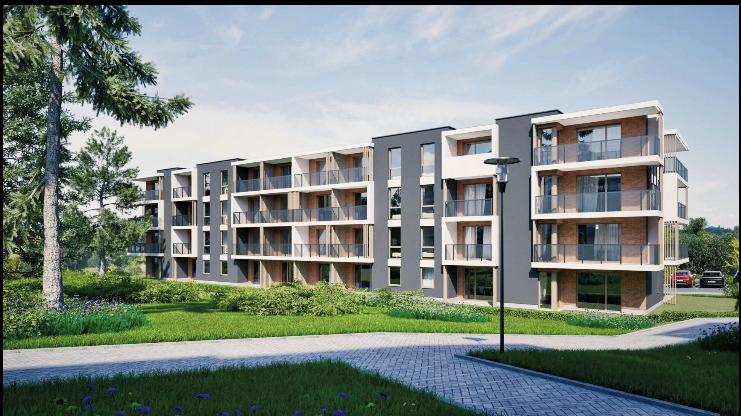 Nowoczesne budynki z halami garażowymi, windami, dużymi balkonami i przemyślanymi układami wnętrz tworzą spójną, estetyczną przestrzeń mieszkalną.